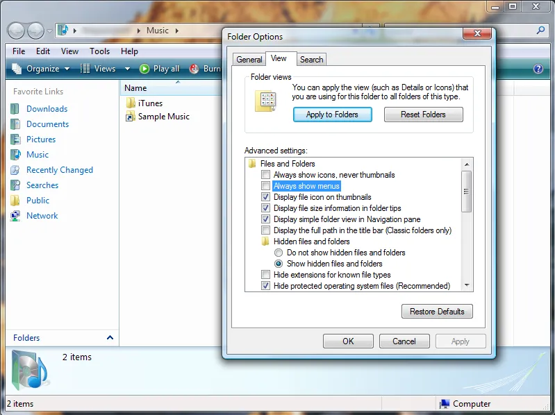 Normally, or at least by default, menus in Windows Explorer on Vista are hidden until you press the ALT key on your keyboard. But for some reason my Vista install displays menus permanently in all Windows Explorer windows. Despite the fact I have the “Always show menus” option disabled: