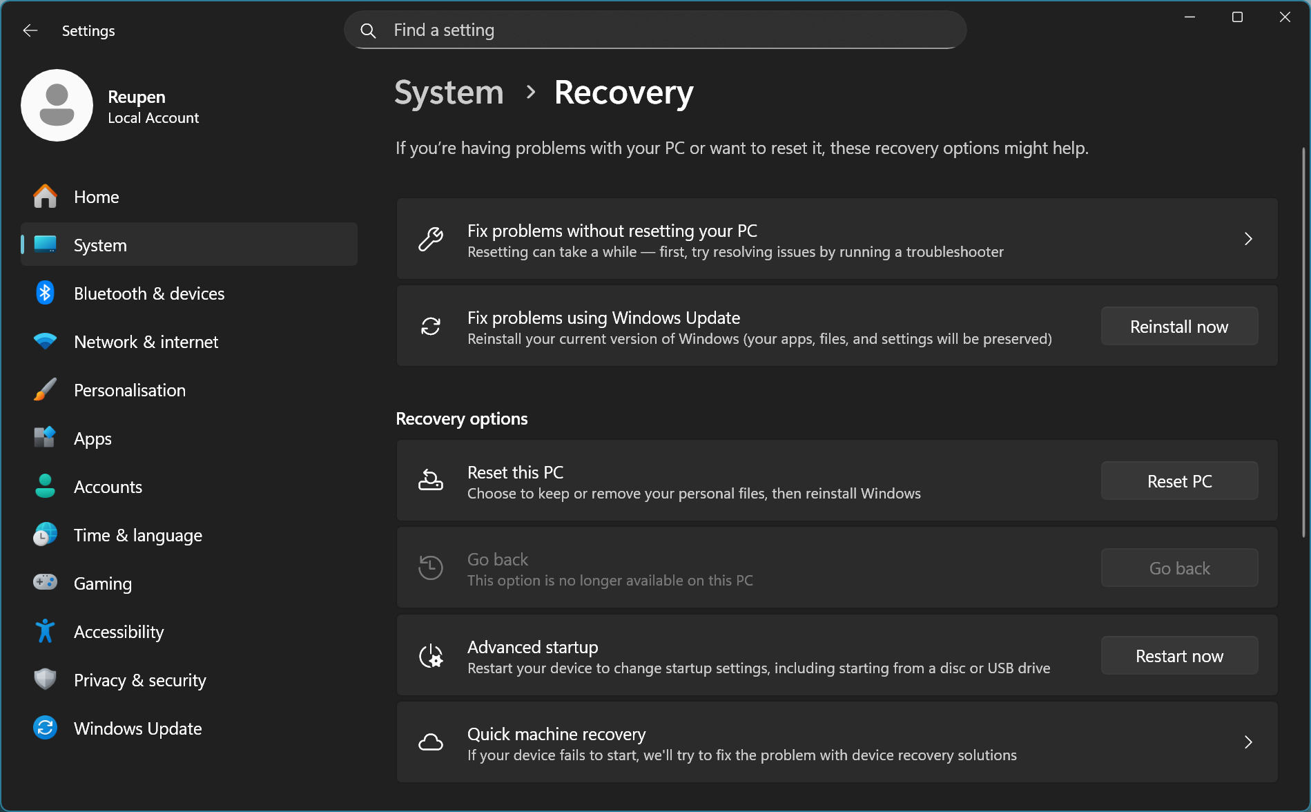 I was going to do this by downloading and using the Windows 11 25H2 ISO from Microsoft. But it turns out that you can do it via the Settings app, via the ’Reinstall now’ button next to ‘Fix problems using Windows Update’, on the System > Recovery page: